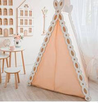Drewniany domek dla psa z legowiskiem i miskami, beżowa kratka