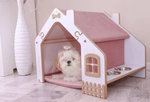( ilość produktów: 4 )Drewniany domek dla psa z legowiskiem i miskami, różowy