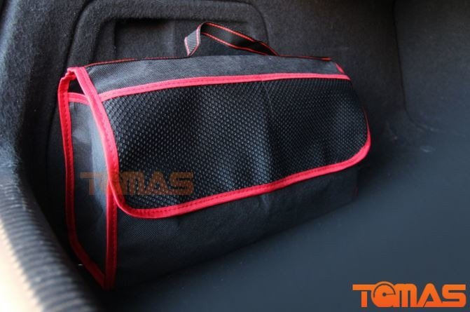 Torby do bagażnika o kolorze czarnym z czerwonymi wstawkami. Torba wykonana jest z mocnego, tapicerskiego materiału. U góry torby znajduje się mocna rączka, za którą można swobodnie przenosić kuferek oraz zamykana jest na rzep z przodu. Kuferek posiada pojemną komorę na akcesoria samochodowe, a z przodu poręczną kieszonkę na drobiazgi. Torba posiada mocne rzepy z tyłu oraz spodu kuferka zabezpieczające kuferek przed przesuwaniem się w bagażniku. Klapa zapinana na rzep. Odporna na warunki atmosferyczne.