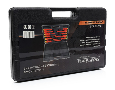 Zestaw wkrętaków został wykony z wysokiej jakości materiałów. Groty posiadają satynowe wykończenie, zabezpieczające przed korozją. Rączka została wykonana z tworzywa sztucznego i pokryta gumową powłoką, która gwarantuje pewne trzymanie w dłoni.