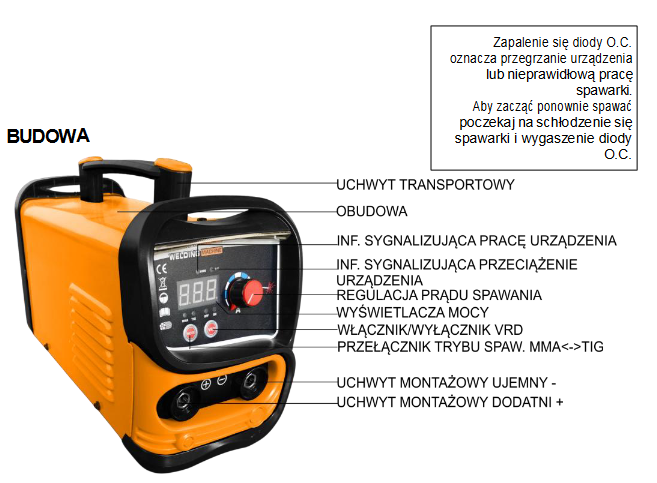 Spawarka posiada system VRD – to redukcja napięcia, którego zadaniem jest wyłączenie zasilania w