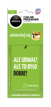 Zawieszka zapachowa z najnowszej serii „Let's smile” od marki Aroma Car. Wysokiej jakości celulozowa zawieszka nasączona jest aromatyzowaną substancją do powieszenia na wewnętrznym lusterku w samochodzie. Seria charakteryzuje się kolorowymi odświeżaczami z humorystycznymi napisami.