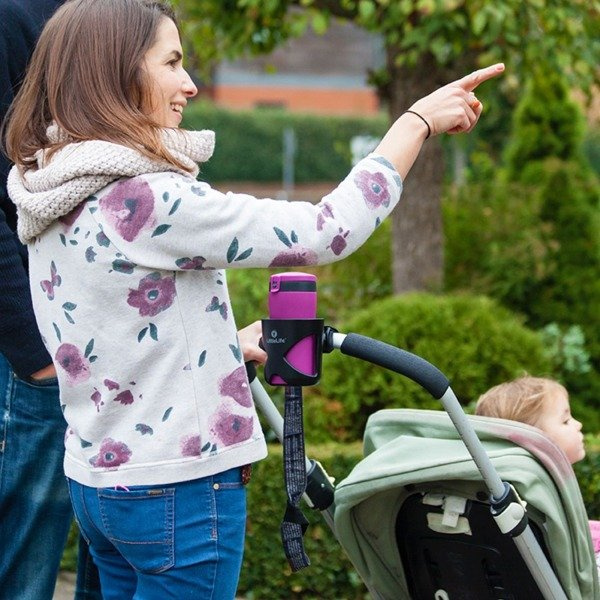 Specjalny uchwyt do wózka pasuje do większości butelek i kubków. Uchwyt posiada specjalną rączkę, za pomocą której możemy przyczepić go do każdego wózka. Specjalny mechanizm, umożliwia płynną regulację pozycji kubka, dzięki czemu nie musimy martwić się, że nasze napoje się wyleją.