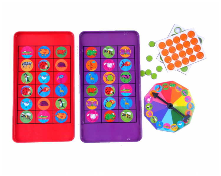 O co chodzi w grze bingo? Gracze wybierają pomarańczowe lub zielone magnesy (pionki), a także plansze ze zwierzętami. Grę rozpoczyna najmłodszy zawodnik kręcąc strzałką na tarczy koła. Wskazane przez strzałkę zwierzę musi być prawidłowo nazwane przez gracza. Gdy zawodnik to zrobi, kładzie na swojej planszy pionek w miejscu wylosowanego zwierzaka. Jeśli zostanie wylosowane zwierzę występujące na planszy dwa razy – gracz używa dwóch magnesów w jednym losowaniu, by zakryć pola. Wygrywa ten gracz, który jako pierwszy zakryje pionkami zwierzęta na planszy w dwóch liniach poziomych lub jednej pionowej i zawoła BINGO! Ilość elementów: 40 magnesów, po 20 sztuk w 2 kolorach. Gra dla 2 osób.