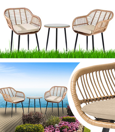 Wygodny fotel stoi na trwałych, mocnych i metalowych nogach malowanych proszkowo. Jest on bardzo stabilny i nie chwieje się na boki. Oparcie wykonano z technorattanu. Cechuje się ono odpornością na uszkodzenia. Nie musisz się martwić zakupem nowego zestawu, bo ten wytrzyma wiele sezonów.