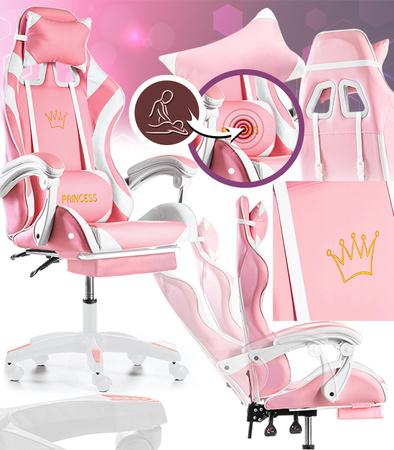 FOTEL GAMINGOWY Z PODNÓŻKIEM RÓŻOWY BIAŁY KUBEŁKOWY BIUROWY OBROTOWY REGULOWANY NOWOCZESNY MASAŻER DLA GRACZA DZIECI MŁODZIEŻY